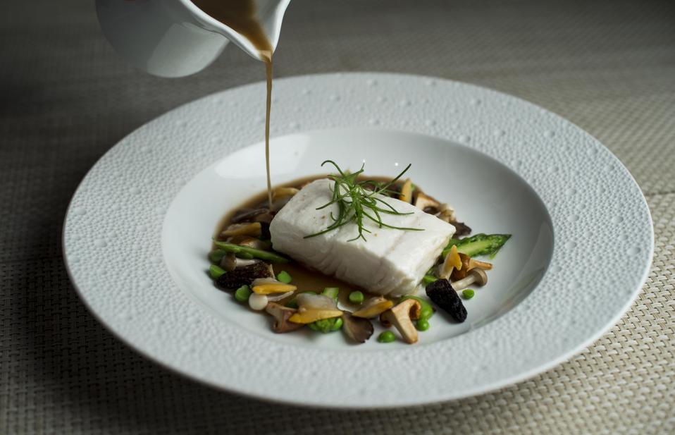 Posjert kveite med manila, muslinger og chanterelle på Le Bernardin—en av de beste restauranter i … verden.,