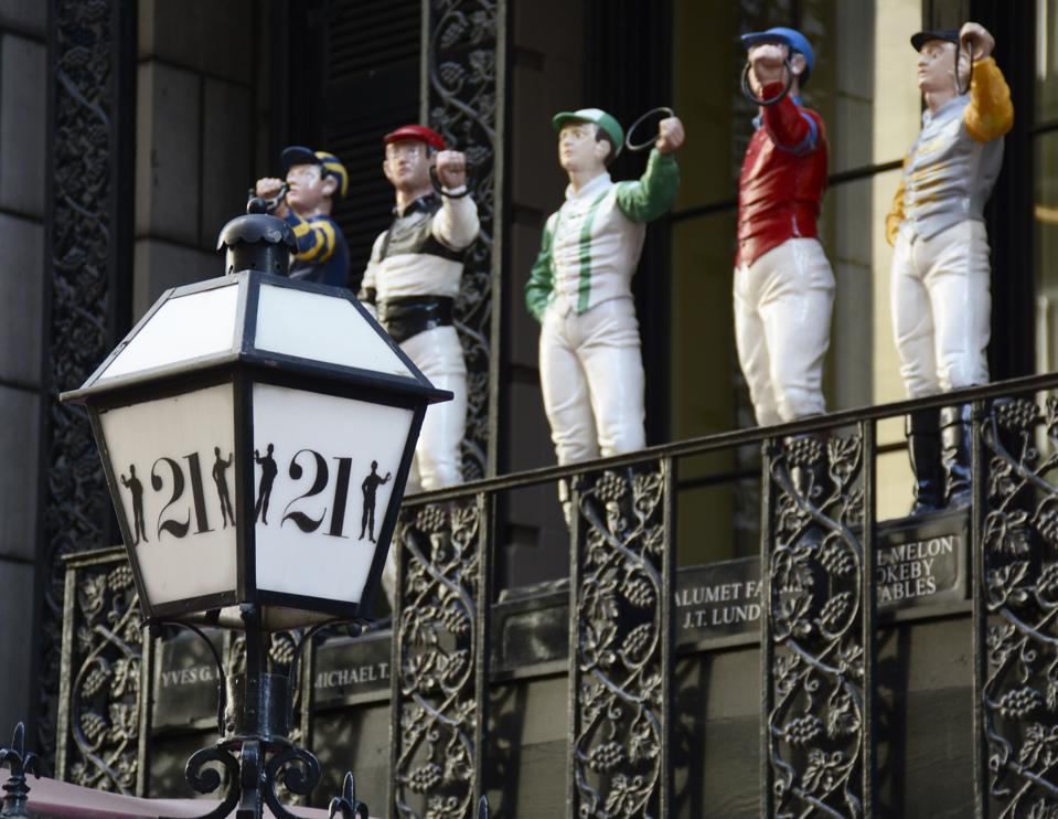 21 Club i Midtown Manhattan, og er et tidligere forbud-epoken speakeasy, har en fargerik …, samling av små malt støpejern plen jockey statuer som pryder balkong over inngangen. (Foto: Robert Alexander/Getty Images)