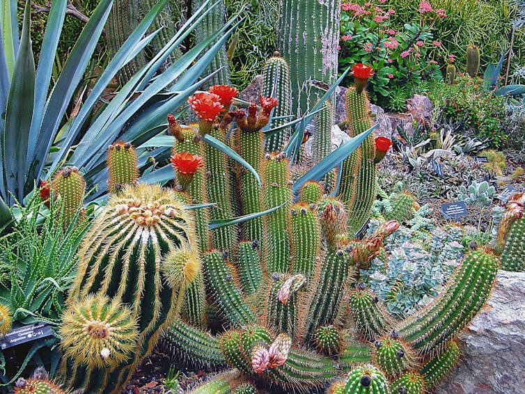 als planten geen water meer hebben, sluiten ze hun stomata af en stopt de fotosynthese en wordt deze vervangen door fotorespiratie – een proces waarbij kooldioxide vrijkomt. Woestijnplanten omzeilen dit door ‘ s nachts te ademen en kooldioxide op te slaan voor afgifte aan fotosynthese gedurende de dag, terwijl de stomata gesloten zijn. Maar in onze tuinen zijn weinig planten aangepast om dat te doen.